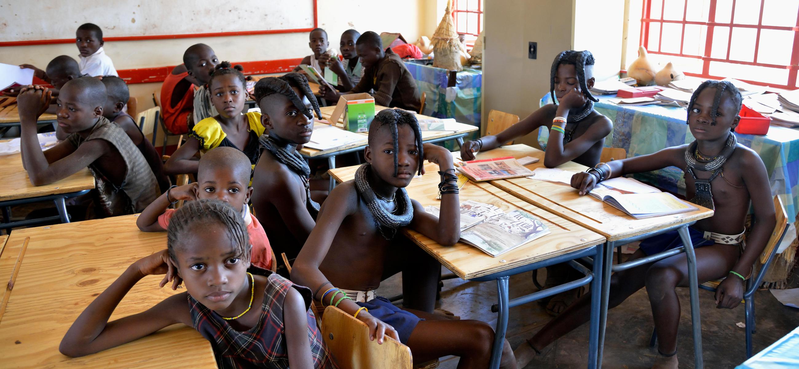 Schulrektor Paulus Mumati mit dem Stumpf in Kontakt steht ist selbst kein Himba. Er gehört der Bevölkerungsmehrheit der Ovambos an und hat sich aus der benachbarten Heimatprovinz in diese Region versetzen lassen und kämpft wie ein Löwe für seine Schule. Zwar bezahlt der Staat die mageren Lehrergehälter und stellt das karge Inventar bereit. Aber für die Versorgung von Lehrern und Schülern muss die Schule selbst sorgen und das ist durchaus aufwendig: Die damals knapp 100 Schülerinnen und Schüler im Alter von fünf bis 16 Jahren sind nämlich die ganze Woche über in der Schule. Bis zu 20 Kilometer Fußmarsch mussten die Kinder und Jugendlichen jeden Montag hin und jeden Freitag zurück bestreiten. Seit 2013 ist der Schulbesuch kostenlos, vorher waren umgerechnet 30 Euro pro Trimester zu bezahlen. Was die Himba an die Grenze des Belastbaren brachte, die Geld besten-falls aus dem Verkauf von selbst angefertigtem Schmuck an Touristen erwirtschaften.